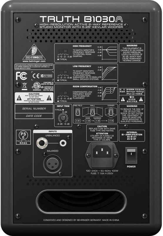 Корпус TRUTH B1030A выполнен из ДСП и имеет магнитную защиту, предотвращающую появление шумов и помех, вызванных работой бытовой техники и других электроприборов. Для улучшения качества звука используется три частотных фильтра, сложным образом меняющих вид передаточной функции. Они выглядят как переключатели между положениями +2, -2, -4 дБ и управляют высокими (5-7 кГц), низкими (60-70 Гц) и ультранизкими (до 500 Гц) частотами. Последний фильтр называется Room Compensation и служит для учёта параметров помещения.
