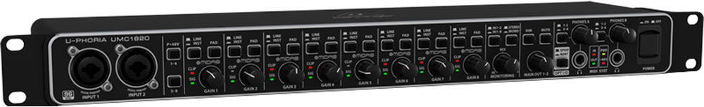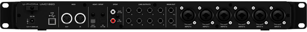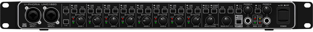 В UMC1820 для прямого мониторинга с нулевой задержкой предусмотрен регулятор mix, который позволяет музыкантам слышать свое исполнение в возвращающемся сигнале чисто без отставания и задержки. Выход phone имеет собственный регулятор уровня и выбор монитора А/В для ди-джей реплик. UMC1820 имеет 18 входов и 20 выходов плюс встроен MIDI вход/выход. На задней панели расположен USB 2.0 порт и аналоговые выходы, включая 1/4" TRS, RCA и XLR. Встроенный MIDI вход/выход позволяет подключать клавиатуры и другое MIDI оборудование. ADAT вход дает возможность подключения ADA8200, тем самым расширить систему до 16 MIDAS микрофонных предусилителей. Плюс интерфейс поддерживает все стандартные форматы, включая S/PDIF, ADAT, S/MUX и аналоговые.