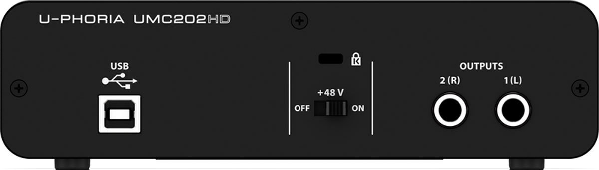 На задней панели UMC202HD Вы найдете порт USB 2.0 для простого и легкого подключения к компьютеру, а также 1⁄4" TRS и XLR разъемы.