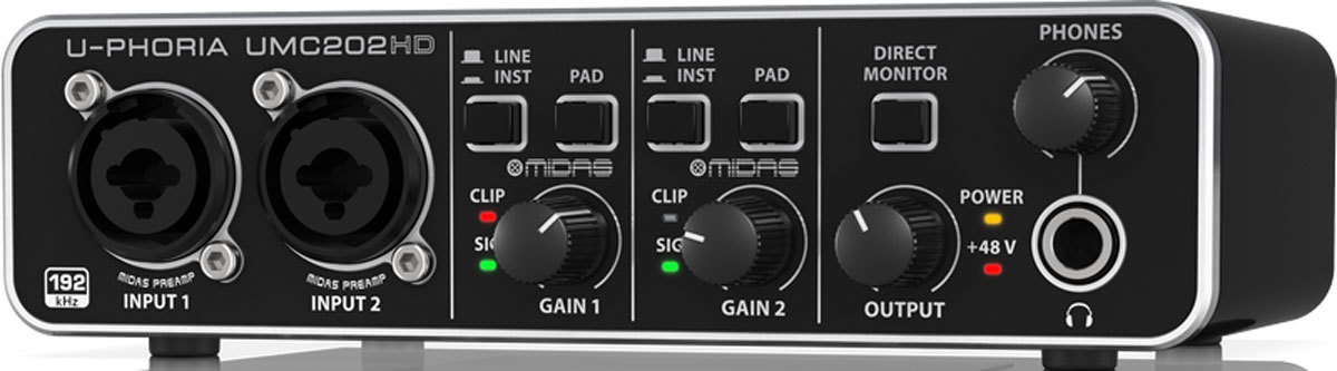 BEHRINGER UMC202HD - аудиоинтерфейс 2x2, 24-Бит/192 кГц USB аудио интерфейс с микрофонными предусилителями MIDAS, фантом +48.
