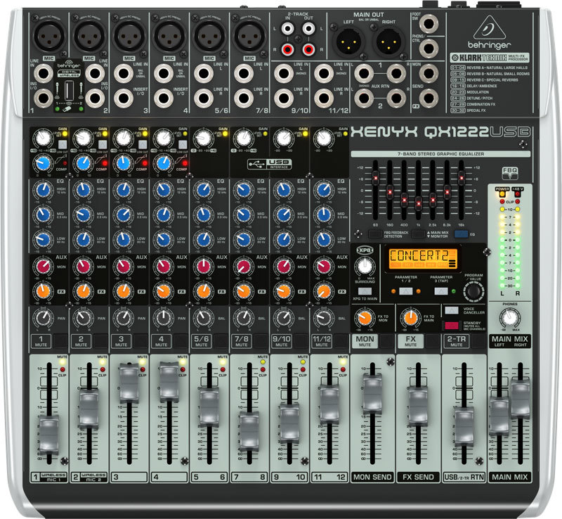 BEHRINGER XENYX QX1222USB микшерный пульт с процессором эффектов Klark Teknik, 6 микрофонных входов (4 с компрессором) 2 или 4 линейных стереопары, 60мм фейдеры, 7и полосный графический эквалайзер, ПО Tracktion4 в комплекте.