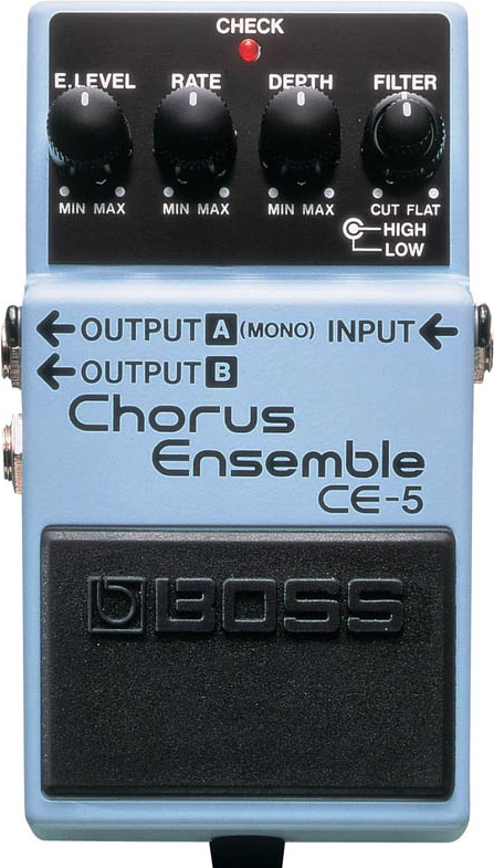 Педаль гитарных эффектов CE-5: Стереохорус от фирмы BOSS – это компактная новинка, охватывающая широкий частотный диапазон, а так же, имеющая набор фильтров для среза высоких и низких частот. Таким образом, владелец сможет придать эффекту абсолютно любой оттенок – от мягкого, естественного хоруса, до пронзительного стерео-хоруса, широко распространенного в современной музыке.