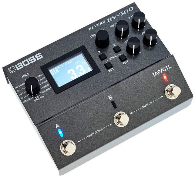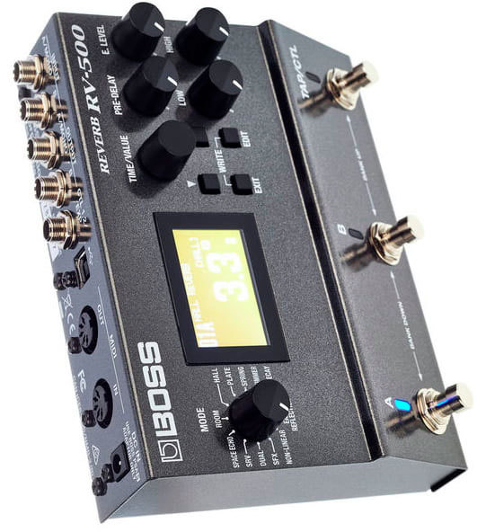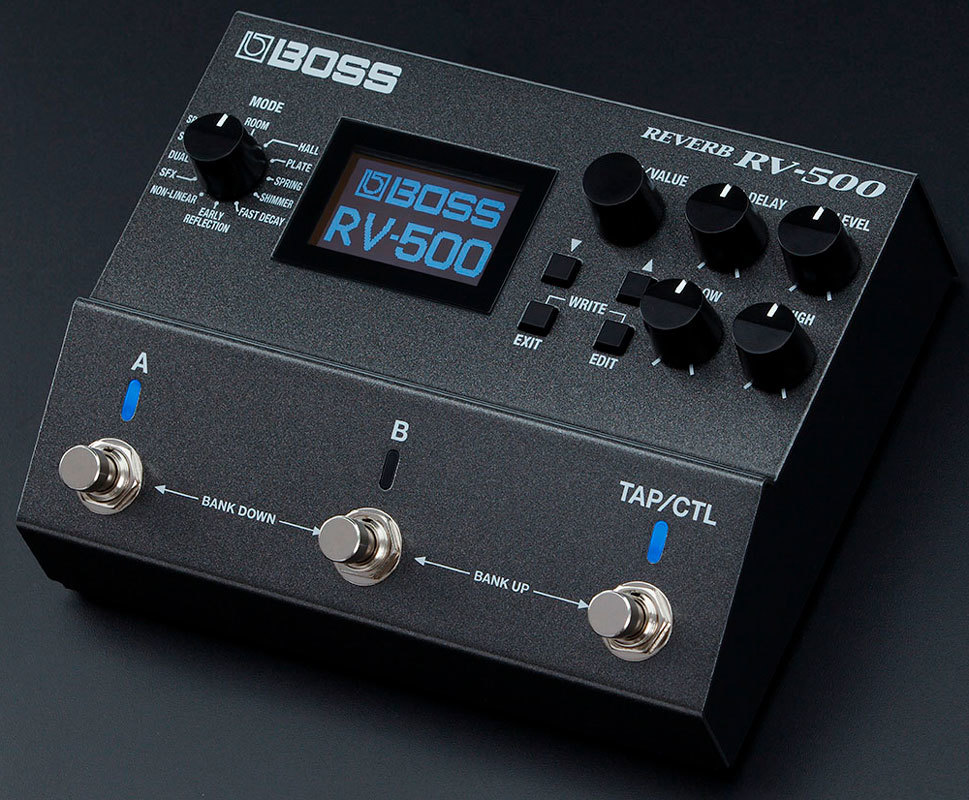 BOSS RV-500 реализует работу 21 высококачественного алгоритма реверберации, которые позволяют имитировать акустические характеристики практически любого помещения. Каждый из алгоритмов предусматривает возможность настройки множества параметров, начиная с задержки, плотности, модуляции и заканчивая эквализацией, дакингом и другими установками. Все алгоритмы были специально разработаны именно для этой педали с использованием многолетнего опыта, накопленного компанией BOSS в области производства ревербераторов. К вашим услугам полный комплект, начиная со стандартной реверберации комнаты. зала и пластинчатого ревербератора, и заканчивая специализированными алгоритмами, такими как "космический" шиммер, нелинейная реверберация, спецэффекты SFX и многое другое. Также заново реализованы реплики RE-201 Space Echo и SRV-2000 Digital Reverb — ставшие в семидесятых и восьмидесятых годах "классикой" эффекты компании Roland.