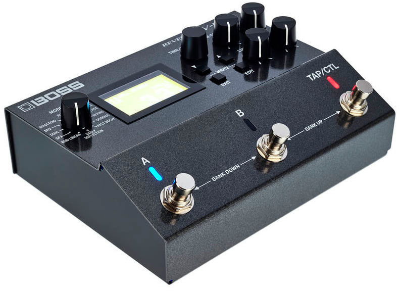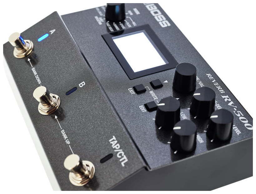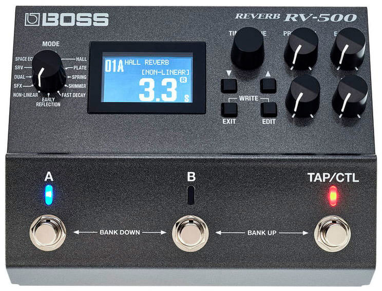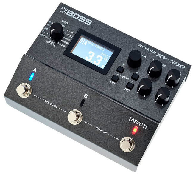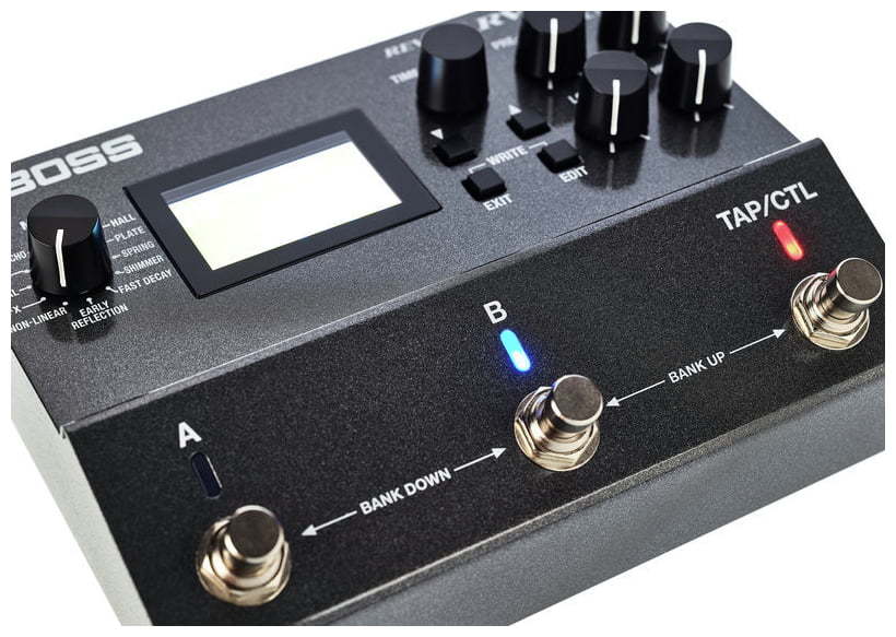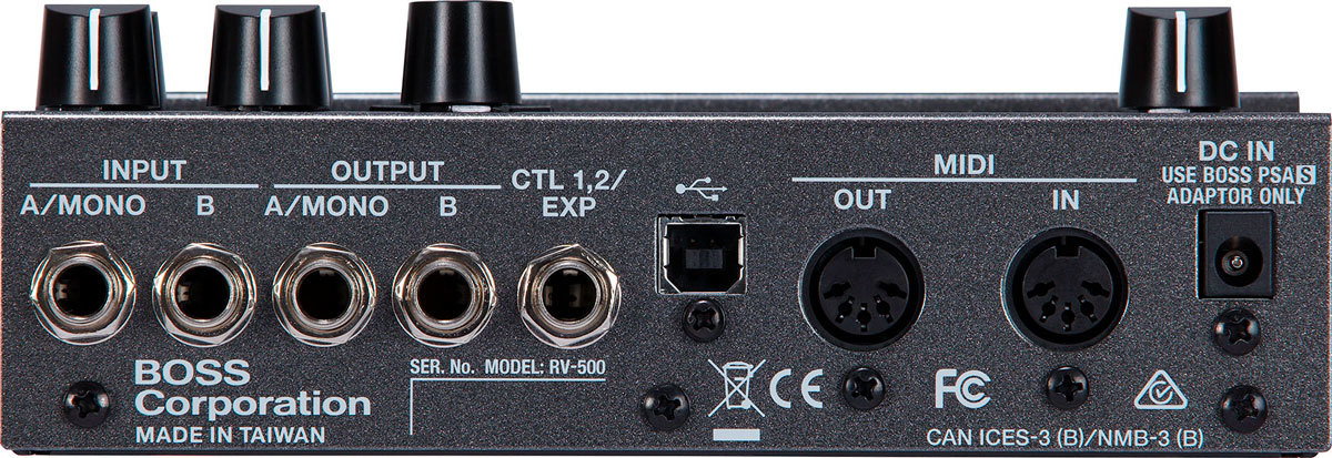 Свободное программирование выключателей и расширенные функции управления в реальном времени превращают RV-500 в устройство с беспрецедентно высоким креативным потенциалом и гибкими исполнительскими возможностями. По умолчанию переключатели A, B и TAP/CTL запрограммированы на выбор пресета/банка и режима обхода, а также могут использоваться для настукивания темпа и управления различными параметрами эффекта в реальном времени. В случае необходимости их можно назначить на вызов трех различных реверберационных пресетов, переключение состояния режима A/B Simul и другие функции. Вход/выход MIDI открывает перед пользователем широкие творческие горизонты, обеспечивая углубленные возможности управления.