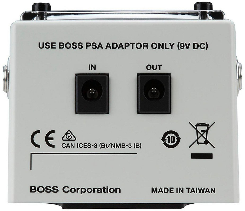 - Электропитание от опционального адаптера серии PSA, выход DC Out для подключения по цепочке кабелем PCS-20A до семи компактных эффект-педалей BOSS