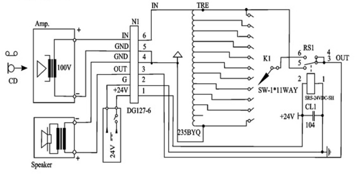 - система фоновой музыки использует аттенюатор на 100 вольт;