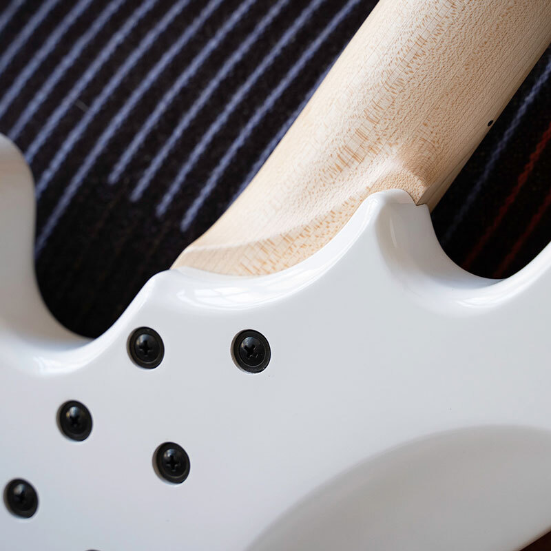 Уникальная особенность Elrick NJS: место соединения грифа и корпуса значительно уменьшено, чтобы облегчить доступ к верхнему регистру грифа. Для оптимизации стабильности и игровых качеств, гриф крепится шестью болтами в асимметричном порядке.