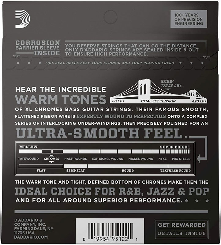 Струны D'Addario Chromes Bass имеют оплетку из плоской проволоки из нержавеющей стали и отполированы до чрезвычайной гладкости. У этих струн характерное смягченное, но насыщенное звучание, которое может обеспечить только плоская оплетка. D'Addario Chromes — самые популярные струны с плоской оплеткой в мире.