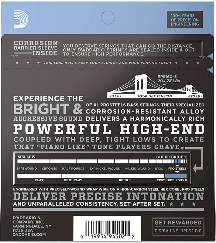 Струны ProSteels хороши как для артикулированной пальцевой игры, так и для агрессивного щипкового стиля, позволяя добиваться превосходной остроты и энергии при исполнении микса.