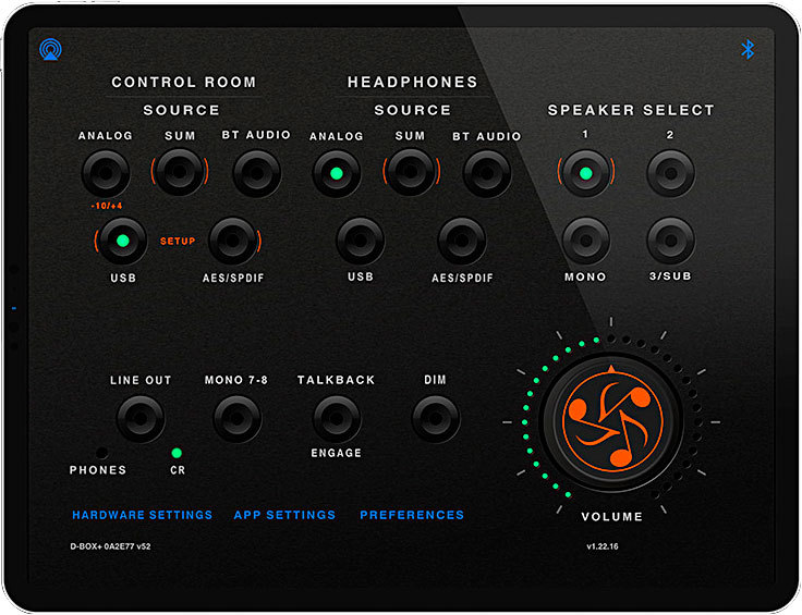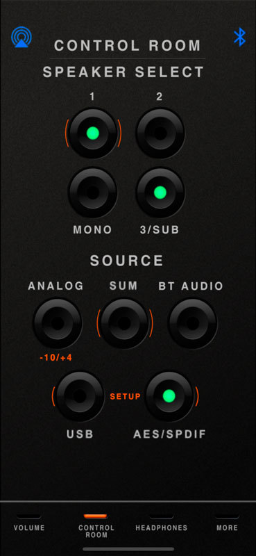 - Прямой доступ к пяти аналоговым и цифровым входам (аналоговый стерео, аналоговая сумма, USB, AES / SPDIF, Bluetooth) - возможен множественный выбор