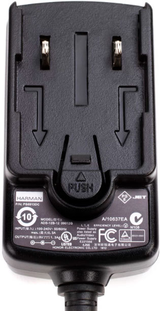 У него отсоединяемые разъемы с комплектными переходниками на европейские, американские и японские розетки с входным током от 100 до 240 Вольт. На выходе адаптер дает 9 Вольт постоянного тока с силой в 1.3 А.
