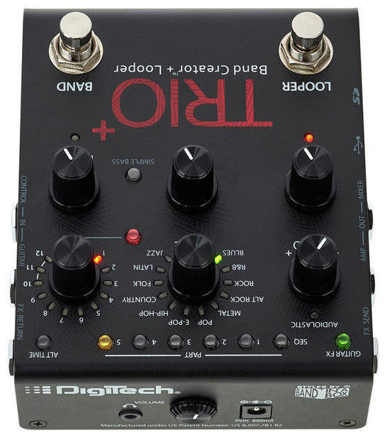 Кроме того, TRIO+ оборудован независимыми регуляторами Tempo, Genre, Style, Loop Level, Bass Level, Drums Level, выходом на наушники Guitar, FX Return и Control входы Amplifier, Mixer, FX Send и выход для наушников встроенными гитарными эффектами (по отношению к музыкальному жанру) футсвитчем с мягким ходом и в комплект входит 9V DC адаптер.