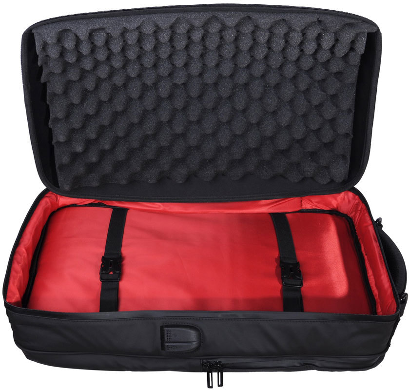 - Основной отсек для хранения и переноски музыкального оборудования имеет пластиковую крышку, которая оберегает оборудование от сильных ударов, дополнительную защиту оборудованию придает рифленый поролон, крепится оборудование к рюкзаку лямками на фастексах защелках. Основной отсек закрывается на водоотталкивающую молнию SBS и имеет секретный замок TSA от воров.