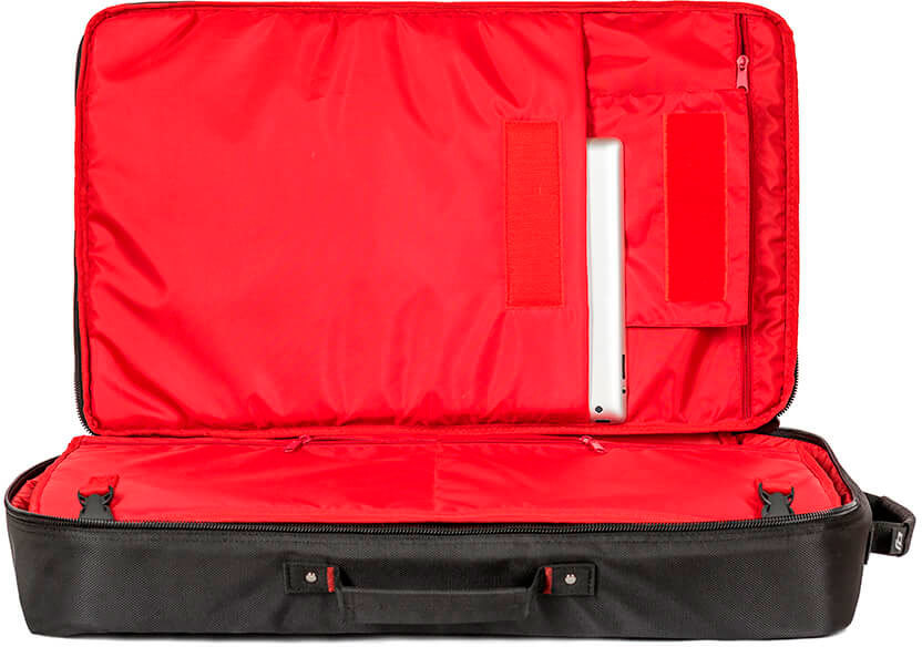 - Крышку сумки от контроллера внутри разделяет мягкий мат с двумя карманами на молнии под размер листа А4 каждый;