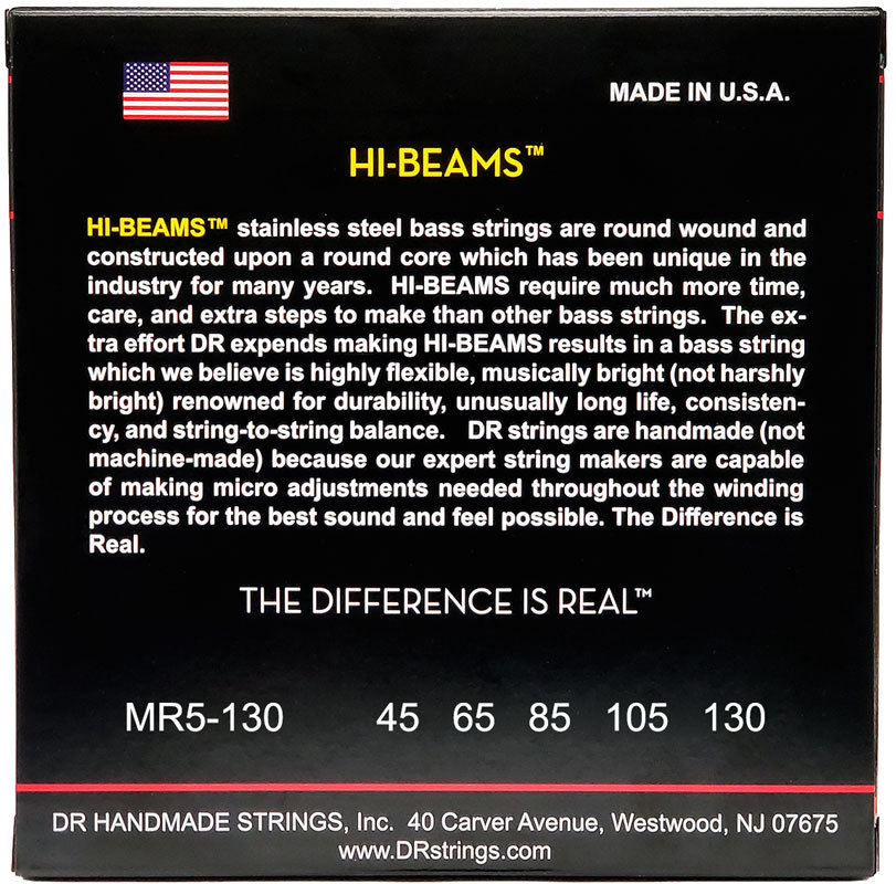 DR MR5-130 HI-BEAM струны для 5 струнных бас гитар 45-130 Medium - Stainless Steel: 45, 65, 85, 105, 130.