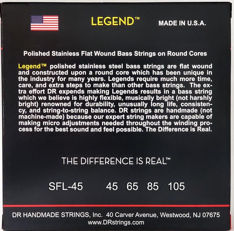 Струны DR для бас-гитар из серии Legend представляют собой круглый сердечник с плоской обмоткой из полированной нержавеющей стали. Характерной чертой плоской обмотки является теплое звучание, а не яркое, как у струн с круглой обмоткой. Это делает их идеальным выбором для игры в таких стилях, как регги, фанк или ритм-н-блюз.