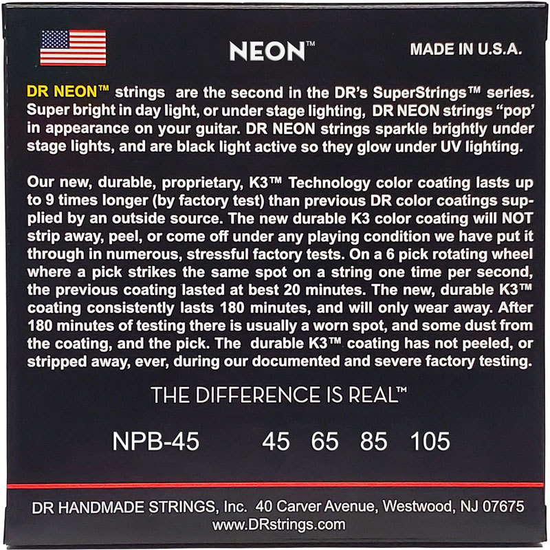 Серия DR HIGH-DEF NEON – это струны для бас-гитар с обмоткой из никелированной стали на круглом сердечнике и люминесцентной оболочкой, нанесенной по патентованной технологии K3. Струны с защитной оболочкой K3 звучат и ощущаются так же, если не лучше, чем обычные струны без оболочки, что подтверждается отзывами бас-гитаристов по всему миру. Гитаристы отмечают высокую громкость этих струн, отсутствие нежелательных обертонов, повышенную чистоту и артикуляцию по сравнению с обычными струнами. И в тоже время, благодаря патентованной защите K3, они обладают повышенной устойчивостью к коррозии и перспирации, что значительно продлевает их срок службы.