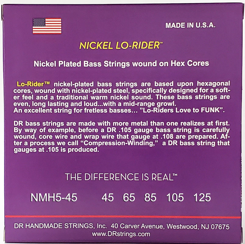 Струны DR для бас-гитар из серии Nickel Lo-Rider были специально созданы, чтобы обеспечить более мягкие ощущения от игры с сохранением теплого звучания, характерного струнам с никелированной обмоткой. Эти струны звучат громко и равномерно с «рычащей» серединой. Это идеальный выбор для безладовых бас-гитар, а также для исполнения музыки в стиле фанк.