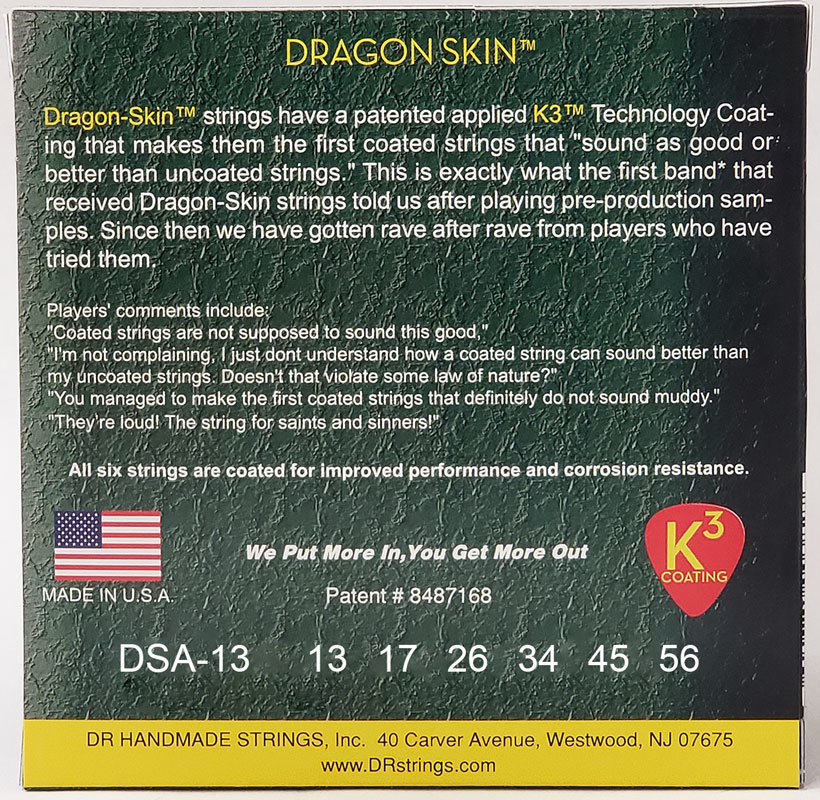 В этих струнах DR сочетается старомодное мастерство ручной работы с самыми новейшими технологиями. Струны покрыты тончайшим (толщина всего 0,0003 мм) химическим напылением K3, защищающим их от пота, грязи, влаги и других воздействий, отрицательно сказывающихся на звучании.