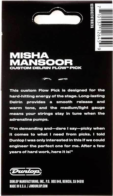 Медиатор Misha Mansoor Custom Flow представлен в двух толщинах: 0,65мм и 0,73мм, чтобы удовлетворить потребности Миши как на сцене, так и в студии.
