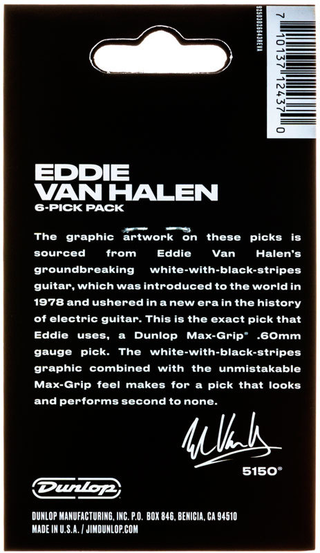Классический рисунок первого Frankenstrat, белого с черного полосами, представленного в 1978 году. Точно такие же медиаторы использует и сам Эдди, Max-Grip толщиной 0,60 мм.