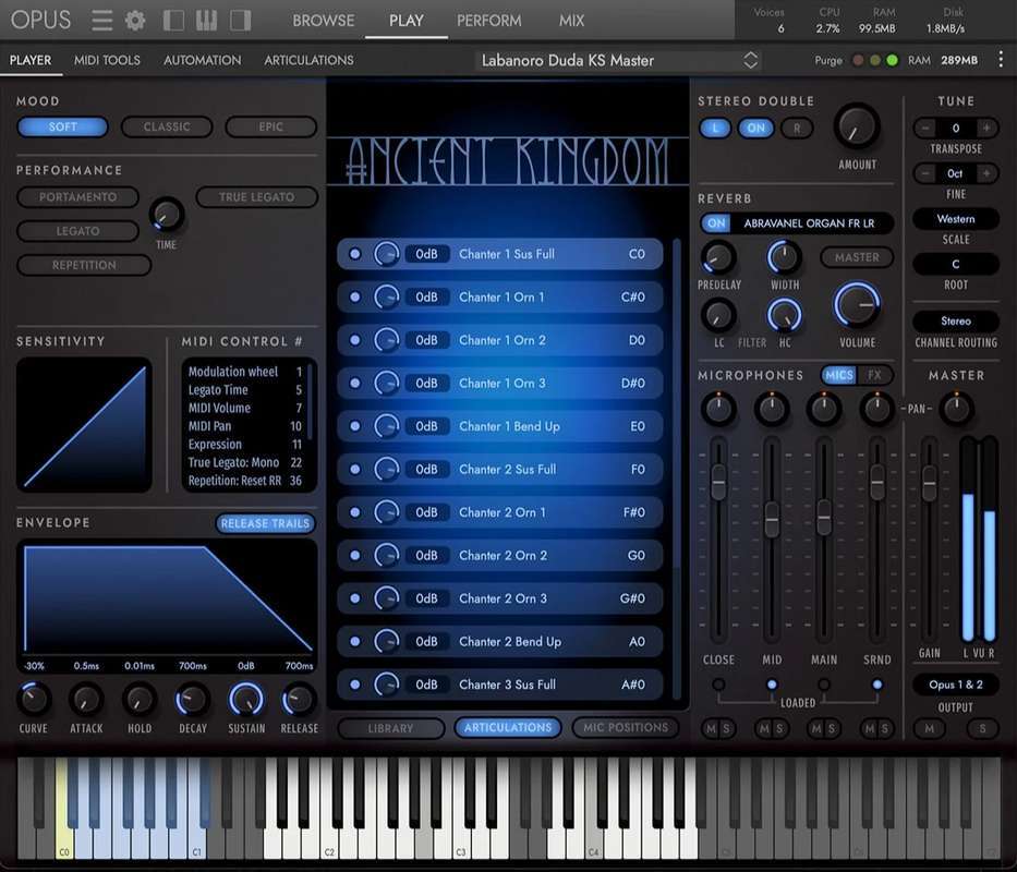 Интуитивно понятный пользовательский интерфейс Ancient Kingdom приглашает вас исследовать первозданную сущность редких духовых инструментов, погружаясь в трансцендентные звуковые царства. Яркий центральный дисплей с поразительными 3D-моделями инструментов и захватывающими пейзажами их происхождения позволяет легко управлять библиотеками инструментов, артикуляциями, мультимикрофонными конфигурациями и многим другим. Левая панель позволяет формировать звук с помощью универсальных пресетов настроек, мощных сценариев исполнения и точных MIDI-регуляторов, а правая панель превращает древние тона в потусторонние текстуры с помощью инновационных FX-миксов, сверточных ревербераторов и гибкой маршрутизации каналов. В дополнение к первозданным записям объемного звука в этой коллекции представлены четыре новаторских сигнальных тракта. В этих трактах используются различные инновационные техники, в том числе усилители, усилители вибрации, металлические поверхности, усилители искажений, мегафоны, трубы и вращающиеся динамики для создания динамичных и захватывающих слуховых ощущений. Эти сигнальные пути переносят звуки в потустороннее измерение, какого вы еще никогда не слышали. Альтернативные сигнальные тракты усиливают эффект присутствия и захватывают внимание слушателя, подчеркивая характеристики атаки инструментов, предлагая смелые и яркие впечатления от прослушивания. Будь то традиционные композиции или экспериментальные звуковые ландшафты, Ancient Kingdom предоставляет богатую палитру звуков, вдохновленных исторической сущностью этих великолепных инструментов.