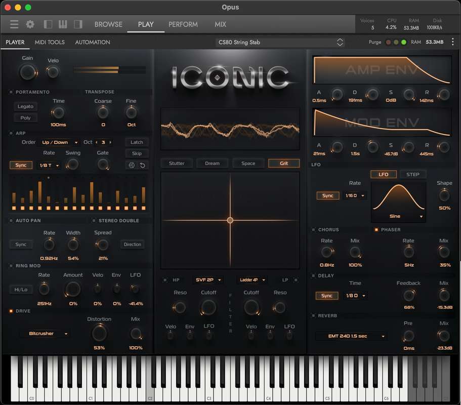 Пользовательский интерфейс ICONIC сосредоточен вокруг FX Pad с 4 выбираемыми макроэффектами, которые модулируют несколько параметров одновременно. Сочетание винтажного дизайна с элегантным современным стилем позволяет легко найти все элементы управления ICONIC на одной странице. Формируйте звуки синтезатора ICONIC с помощью двойных фильтров, которые можно модулировать, продвинутого 16-шагового арпеджиатора, многорежимного портаменто (скольжения) и множества эффектов, расширяющих, пульсирующих, искажающих, задерживающих и пространственно изменяющих конечный звук.