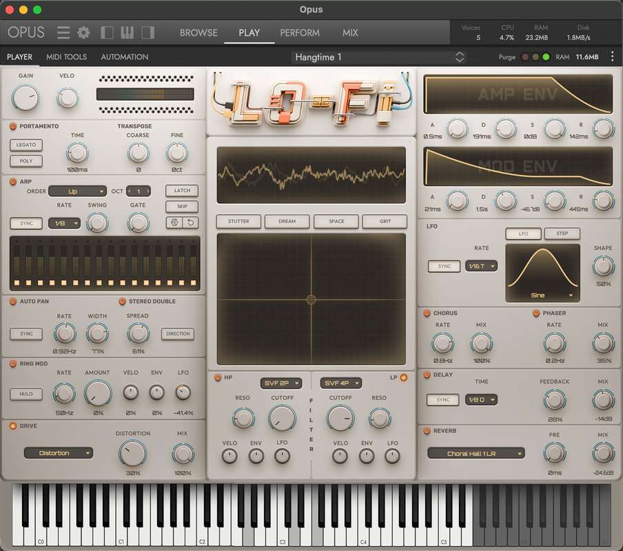 Современные элементы управления для создания хаоса или усиления хаоса - пользовательский интерфейсLO-FI сосредоточен вокруг XY Pad с 4 выбираемыми макроэффектами, которые изменяют несколько параметров одновременно. Сочетая винтажный дизайн с современным стилем, все элементы управления LO-FI легко доступны на одной странице - от двойных фильтров, которые можно модулировать, до продвинутого 16-шагового арпеджиатора, многорежимного портаменто (глайда) и множества эффектов для расширения, пульсации, искажения, задержки и пространственного изменения конечного звука.