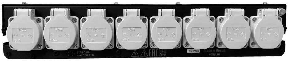 - Выход: розетка РСЕ СЕЕ 32А 3-pol — 1 шт, розетка РСЕ Schuko 16А — 8 шт