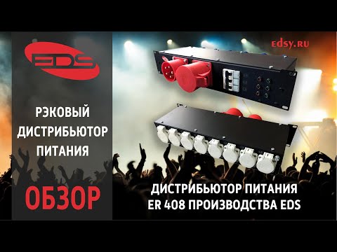EDS ER408 - дистрибьютор питания, позволяющий подключить до 8 единиц светового или звукового оборудования. Устройство может устанавливаться в стандартный 19” рэк или в специальный электрораспределительный шкаф. Трехфазное питание, полученное через расположенную на передней панели 5-контактную вилку силового ввода PCE CEE32A, распределяется на восемь однофазных розеток PCE Schuko 16A, при этом розетки имеют фазы L1L1L1-L2 L2 L2-L3L3. Устройство снабжено встроенной в переднюю панель 5-контактной розеткой PCE CEE32 сквозного канала, подсоединенной к вилке ввода с помощью шлейфа.