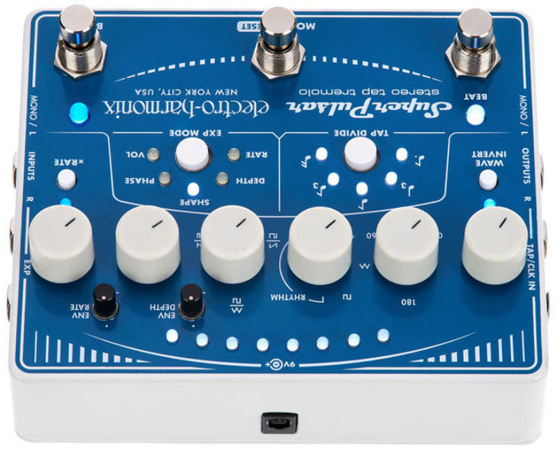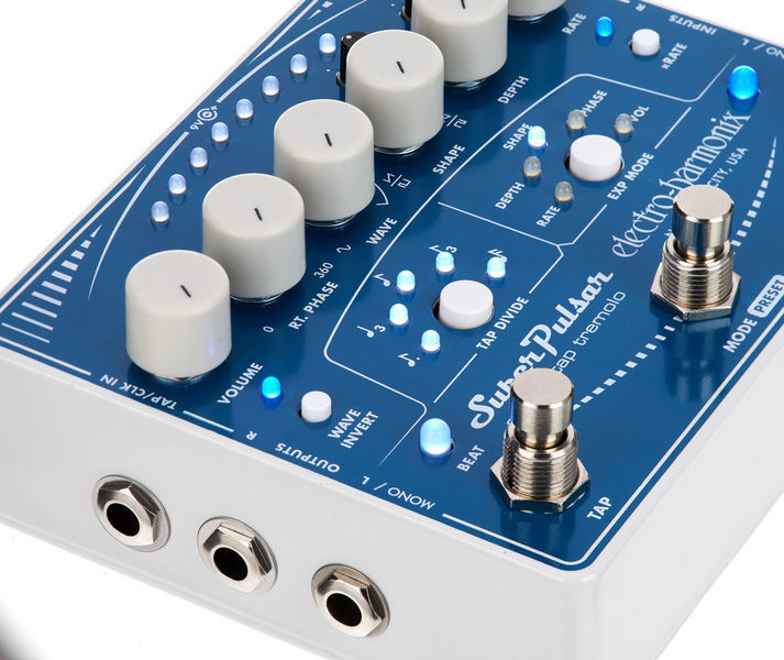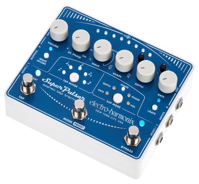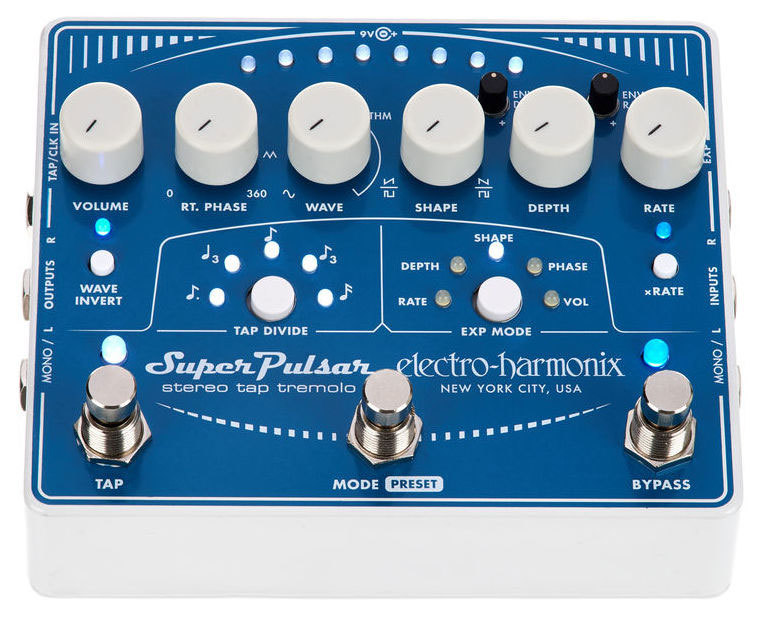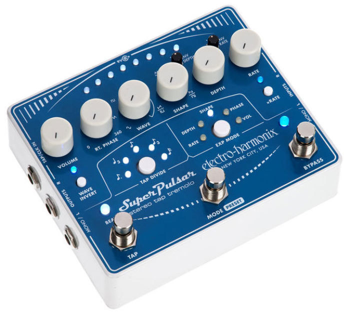 Electro-Harmonix (EHX) Super Pulsar – это многофункциональный тремоло-«комбайн» от ElectroHarmonix. От классического «пульсара» здесь осталось только название: новая педаль от EHX – это настоящий тремоло-монстр, позволяющий получить практически любую форму модуляционной волны, практически в любом ритме и практически любой глубины. От звука классического тремоло «Brownface» до экспериментальных «вертолётных» звуков. Все эти возможности удалось реализовать на аналоговой схеме, так что звучит педаль аутентично и просто здорово: тепло и красиво. Это тремоло, которое «дышит».