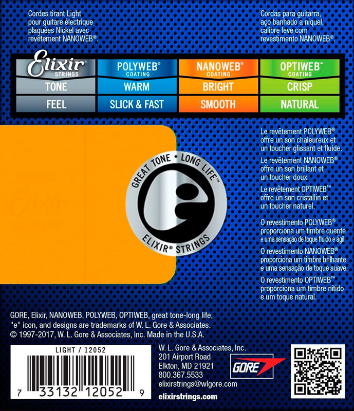 Elixir Nanoweb 12052 Light (10-46) Струны для электрогитары ELIXIR 12052 с покрытием NanoWeb. Эти струны с обмоткой покрыты специальной плёнкой, изготовленной по нано-технологиям. На ощупь эти струны ничем не отличаются от струн без покрытия.