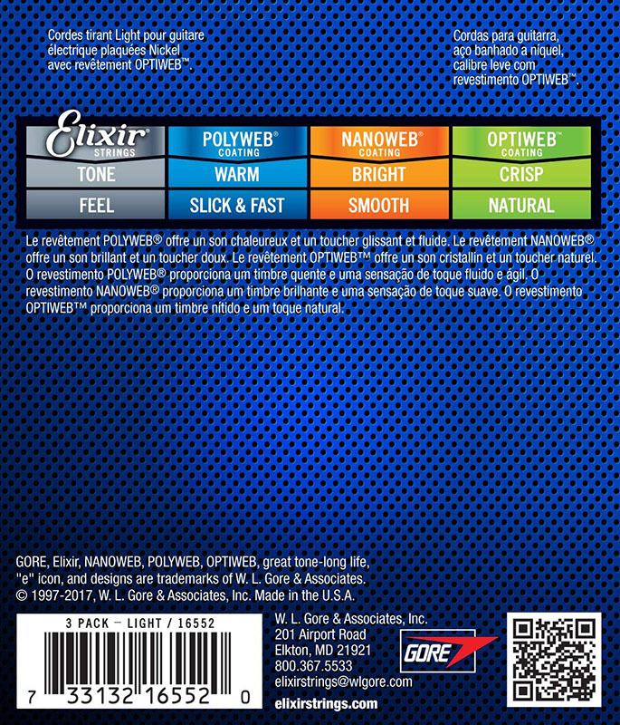 Струны Elixir производятся в США компанией W. L. Gore & Associates, Inc. Появившись на рынке, струны Elixir произвели подлинную революцию. Специальное покрытие защищает струны от разрушающего воздействия внешней среды. Струны Elixir служат в среднем в 4-5 раз дольше, чем обычные струны без покрытия, и при этом превосходно звучат.