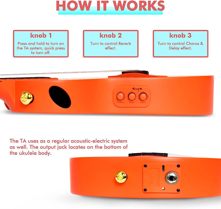 Специально разработанный в сотрудничестве с DOUBLE Acoustics звукосниматель TransAcoustic для укулеле Enya Nova U Pro позволяет легко получать эффекты Reverb, Chorus, Delay без подключения инструмента к внешнему, дополнительному оборудованию.