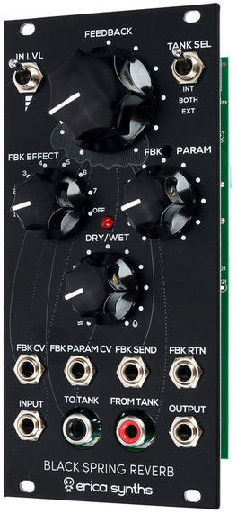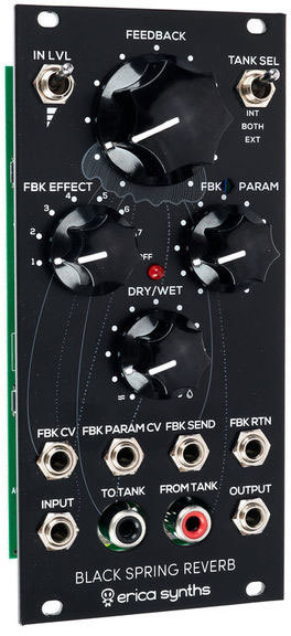 Erica Synths Black Spring Reverb - Eurorack-модуль пружинного ревербератора. Он имеет встроенный аудиокомпрессор на основе vactrol и может управлять внешним резервуаром и сочетанием как внутреннего, так и внешнего для получения необычных эффектов.