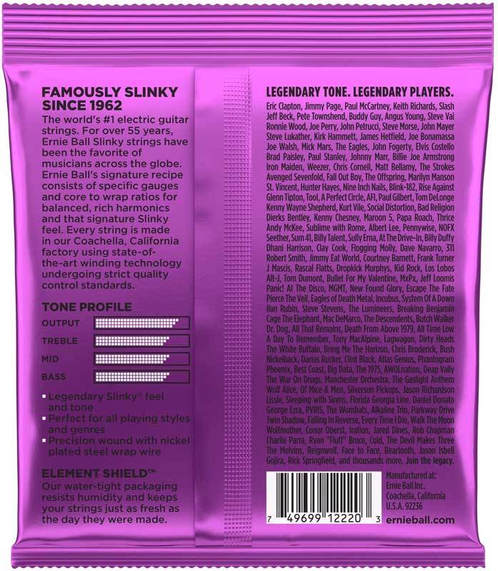 Струны для электрогитар Ernie Ball Power Slinky идеально подойдут любителям ритмов джаз-рока (jazz-rock), ритм-энд-блюза (rhythm’n’blues) и классического рок-н-ролла (rock’n’roll). Кроме того, эти струны могут использоваться и на электроакустических гитарах. Ernie Ball Power Slinky уже долгое время пользуются большим спросом у таких всемирно известных музыкантов, как Слэш (Slash), Кенни Уэйн Шеппард и группа (Metallica), во многом благодаря сочетанию в комплекте струн с увеличенным калибром, обеспечивающих более насыщенное звучание. Струны Ernie Ball производятся по самым высоким стандартам качества и с соблюдением технологии процесса производства, что является гарантией их прочности, надёжности и долговечности. Ernie Ball Power Slinky – это стальная шестигранная сердцевина с никелированной стальной обмоткой. Струны сделаны из специально закалённой высокоуглеродистой стали, что обеспечивает хорошо сбалансированное звукоизвлечение и полностью раскрывает возможности вашего инструмента.