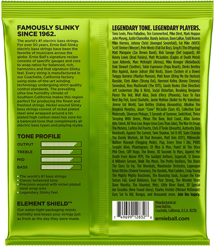 Характерной особенностью серии струн Ernie Ball Slinky Round Wound Bass является никелированная стальная круглая обмотка, обеспечивающая максимальную яркость звучания. Комплект Slinky Round Wound Bass Regular прекрасно подойдёт для любителей агрессивной игры, а также сбалансированного и насыщенного звучания с металлическими нотками. Все без исключения струны Ernie Ball производятся из высококлассных специально разработанных материалов, в местечке Coachella Valley в Южной Калифорнии, а список всемирно известных музыкантов использующих струны Ernie Ball говорит сам за себя.