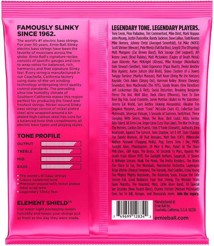 Характерной особенностью серии струн Ernie Ball Slinky Round Wound Bass является никелированная стальная круглая обмотка, обеспечивающая максимальную яркость звучания. Комплект Slinky Round Wound Bass Super прекрасно подойдёт для любителей агрессивной игры, а также звонкого и мощного звучания. Все без исключения струны Ernie Ball производятся из высококлассных специально разработанных материалов, в местечке Coachella Valley в Южной Калифорнии, а список всемирно известных музыкантов использующих струны Ernie Ball говорит сам за себя.