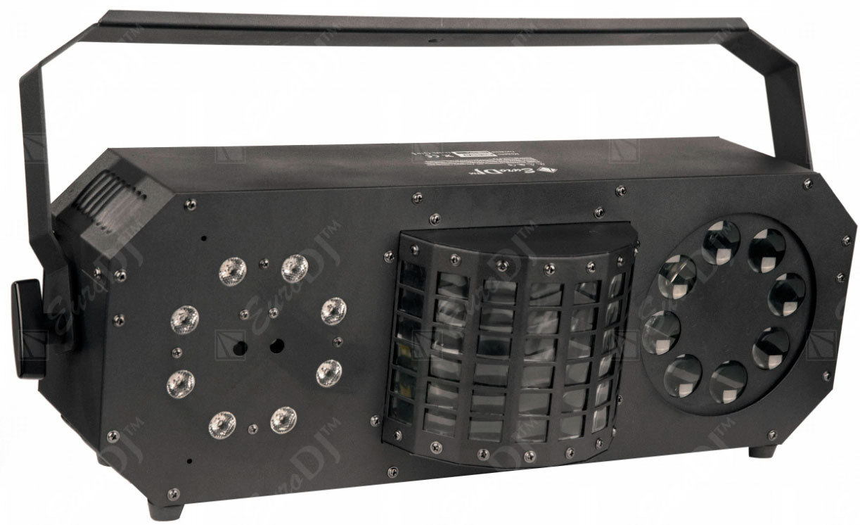 Сочетает четыре абсолютно разных эффекта: лазерный эффект (Laser), два светодиодный дискотечных эффекта (Gobo Moonflower + Agressor) и заливной эффект (Wash Light). По заданной программе, в одном из режимов работы или при управлении с DMX-контроллера, прибор создает целое световое шоу, которое раньше могли обеспечить только четыре разных световых прибора!
