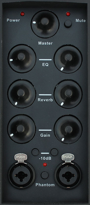 Микшерный пульт имеет 2 комбинированных микрофонных/линейных входа с отключаемым фантомным питанием для конденсаторных микрофонов, с кнопками понижения чувствительности -10дБ, с индивидуальными регуляторами громкости дилей-процессора, а также с регуляторами баланса низких и высоких частот. На задней стенке имеется линейный XLR выход с регулятором громкости для подключения другой активной системы, например, активного субвуфера.
