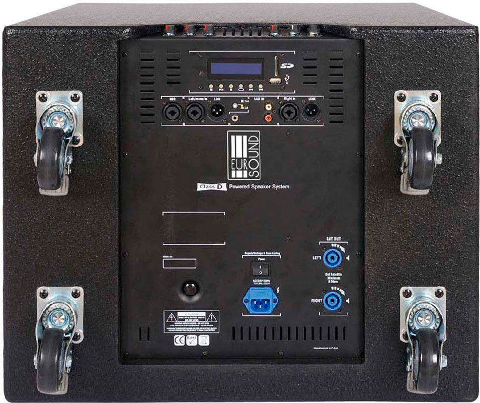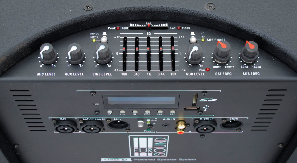 EUROSOUND FOCUS-1100A-USB - активный акустический комплект с USB/SD MP3-проигрывателем и BLUETOOTH интерфейсом, состоящий из активного субвуфера с 15-дюймовым динамиком мощностью 600 Вт и 2 пассивных сателлитов мощностью по 150 Вт с 10-дюймовыми динамиками.