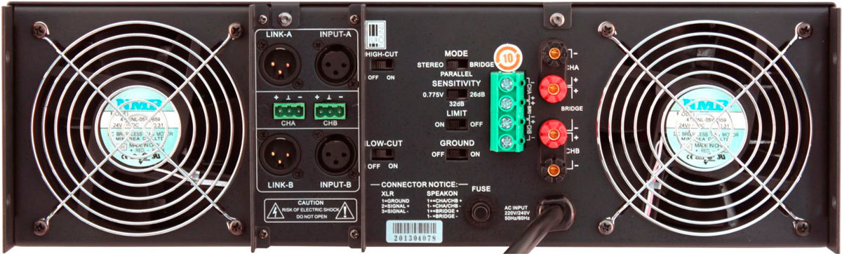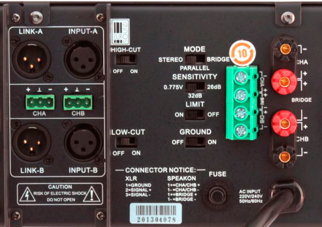 - Управление: регуляторы мощности левого и правого каналов, переключатель HIGH-CUT и LOW-CUT, переключатель GROUND LIFT, переключатель чувствительности, селектор режимов работы BRIDGE-PARALLEL-STEREO, селектор лимитера