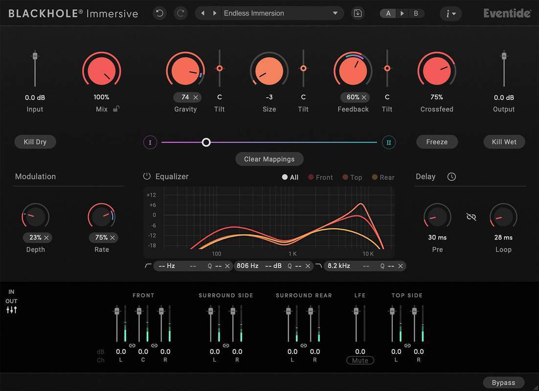 Разработанный с нуля для иммерсивных рабочих процессов, Dolby Atmos и объемного звука (surround), Blackhole Immersive расширяет фирменное звучание стереоверсии Eventide на весь ваш иммерсивный микс. Используемый как посыл (send) или врезной эффект (insert), Blackhole Immersive остается уважительным, но в то же время реагирующим на тщательно выбранное вами позиционирование треков.
