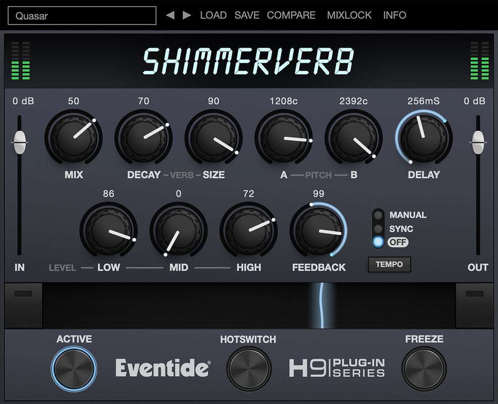 ShimmerVerb также может похвастаться HotSwitch для вызова другого состояния параметров внутри того же пресета. Используйте это для изменения октав, включения/выключения сдвигателей высоты тона или просто для увеличения или уменьшения микса (Mix) во время исполнения. Наконец, кнопка Freeze позволяет создавать смазанные текстуры из отдельных голосов, целых подкладов или перкуссионных элементов, в результате чего получаются металлические «мерцания».