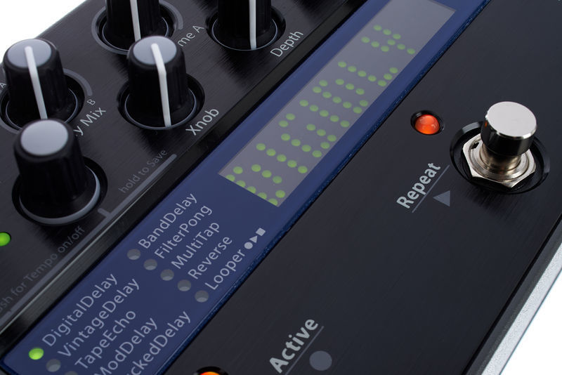 Педаль предоставляет полный набор всех возможных эффектов задержки и их комбинаций - винтажный пленочный дилэй, цифровой дилэй, обратный дилэй, лупер - всего 10 вариаций. Всего на педали два ряда ручек. Одна из них переключает алгоритмы, остальные управляют временем задержки (два контроллера, каждый из которых управляет одним из каналов в стерео режиме - таким образом, вы можете задавать различное время для каждого из каналов), интенсивностью фидбэка каналов, относительным уровнем каждого из двух каналов дилэя, а также смешиванием сигнала дилэя и чистого сигнала вашего инструмента. Во втором ряду расположены контроллеры, чьи функции меняются в зависимости от выбранного режима задержки - Xnob, Depth, Speed, Filter. Для облегчения процесса настройки эффекта, дисплей отображает функцию каждой ручки как только вы начинаете её крутить - просто и эффективно.