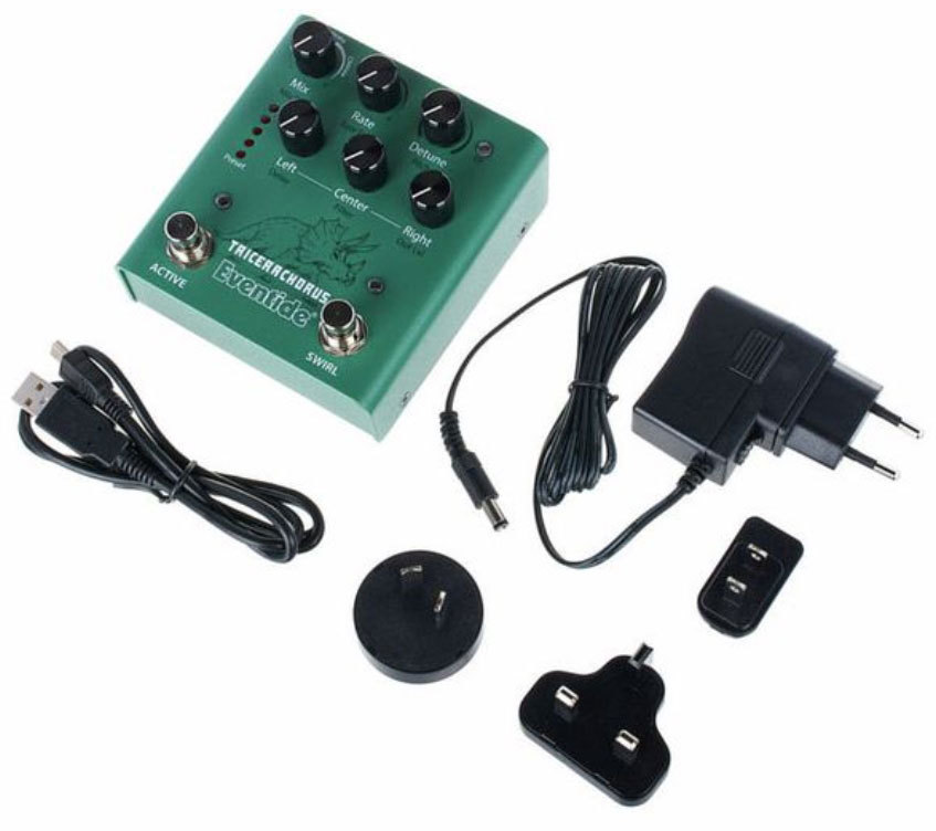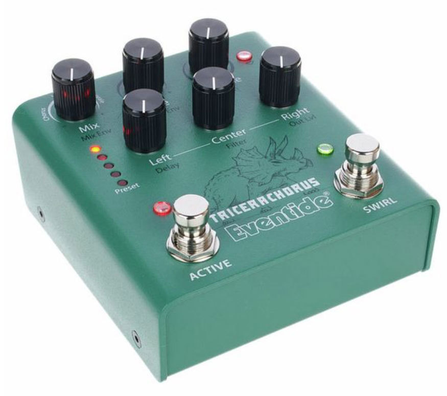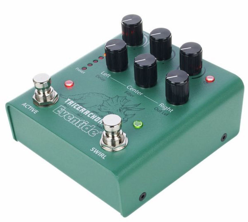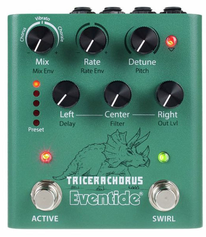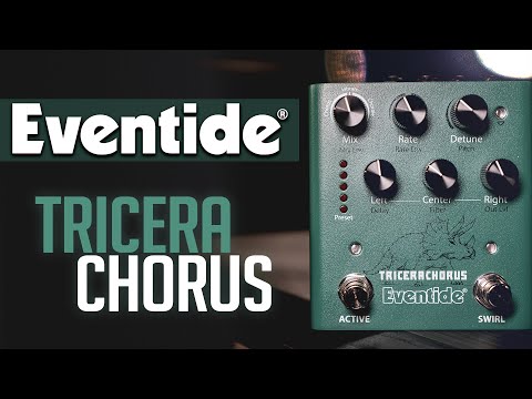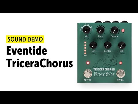 Вдохновленная классическими хорусами Tri-Stereo Chorus и stompbox хорусами 1970-х и начала 1980-х годов, педаль TriceraChorus объединяет богатый хорус в стиле Bucket Brigade с легендарным детюнингом MicroPitch от Eventide, создавая пышность, которая соперничает с джунглями позднего мелового периода. TriceraChorus имеет три голоса хоруса и три уникальных эффекта хоруса, которые можно использовать для создания широкого стереофонического диапазона с пульсирующими волнами модуляции. Инновационный педальный переключатель "Swirl" добавляет психоделический фленджинг, фейзинг и тон в стиле Univibe. Никогда еще не было так просто создать текучую, густую, гладкую, глубокую модуляцию на гитаре, басе, синтезаторе, струнных, вокале и многом другом.