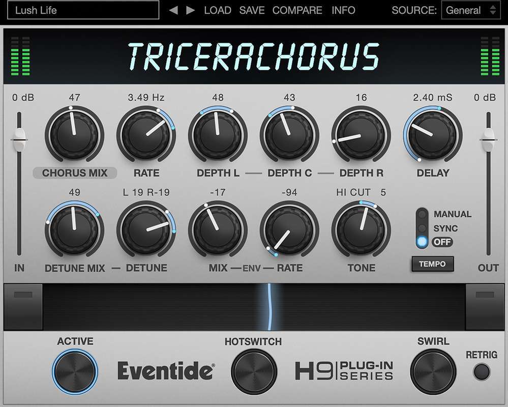 TriceraChorus вдохновлен классическими три-хорусами и педальными хорусами 1970-х и начала 1980-х годов, особенно Dyno-My-Piano и Dimension D. Он объединяет богатое три-хорирование в стиле BBD с другим фирменным эффектом Eventide: микросдвигом высоты тона (micro-pitch detuning). Этот эффект можно использовать для утолщения звука, добавления плотности и расширения стереополя путем расстройки левого и правого сигналов и их панорамирования в противоположные стороны. Комбинируйте эти инструменты для создания сиропообразных, гладких и глубоких модуляций на чем угодно: от плоских синтезаторов и струнных до вокала, гитар и многого другого.