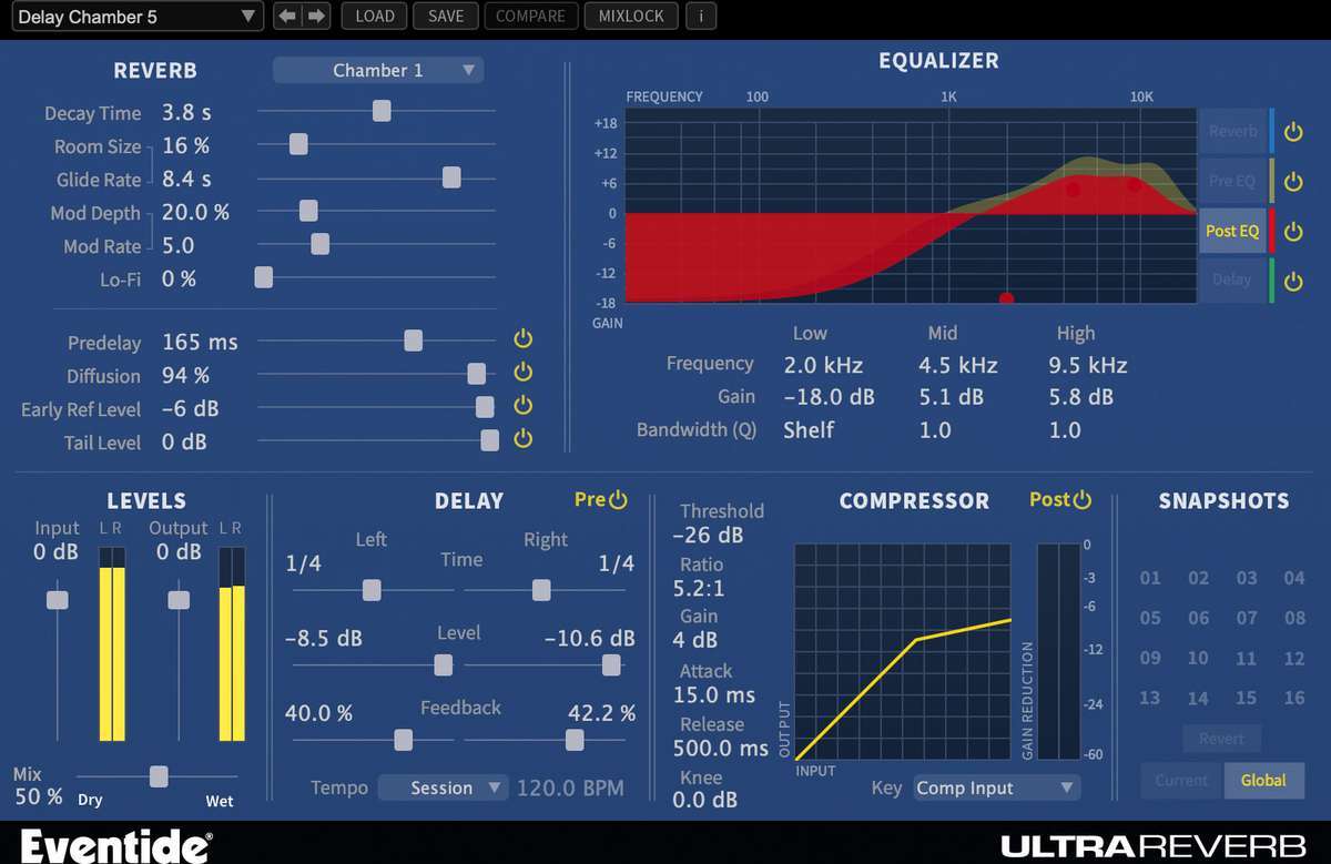 UltraReverb — это комплексный набор инструментов для реверберации с девятью алгоритмами реверберации, производными от аппаратного процессора H8000, для реалистичной симуляции залов, камер, комнат, пластин и атмосферы или, если зайти в крайность, потусторонних сред. Набор инструментов включает 4 параметрических эквалайзера, компрессор и задержку, которые могут быть направлены до (pre) или после (post) реверберации. Упакованный с более чем 300 пресетами, это, пожалуй, самый всеобъемлющий из доступных плагинов реверберации.