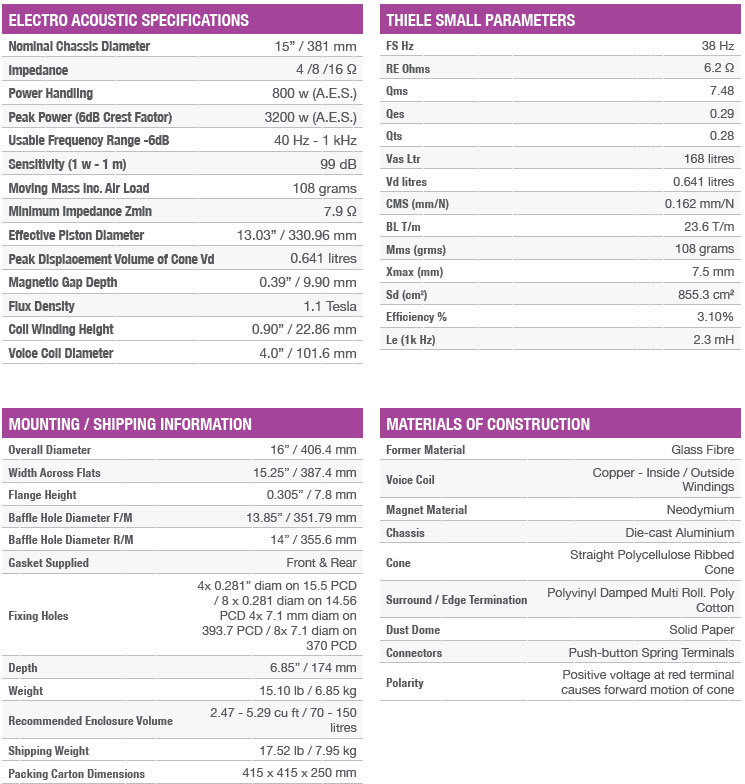 FANE COLOSSUS 15XBN Динамик низкочастотн., неодим., 800/3200 Вт, 40Гц-1кГц, 15', 4/8/16 Ом FANE Англия