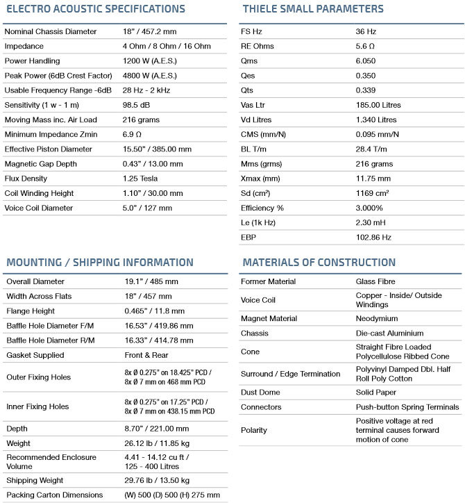 FANE COLOSSUS 18XT5N Динамик низкочастотн., неодим., 1200/4800 Вт, 28Гц-2кГц, 18, 4/8/16 Ом FANE